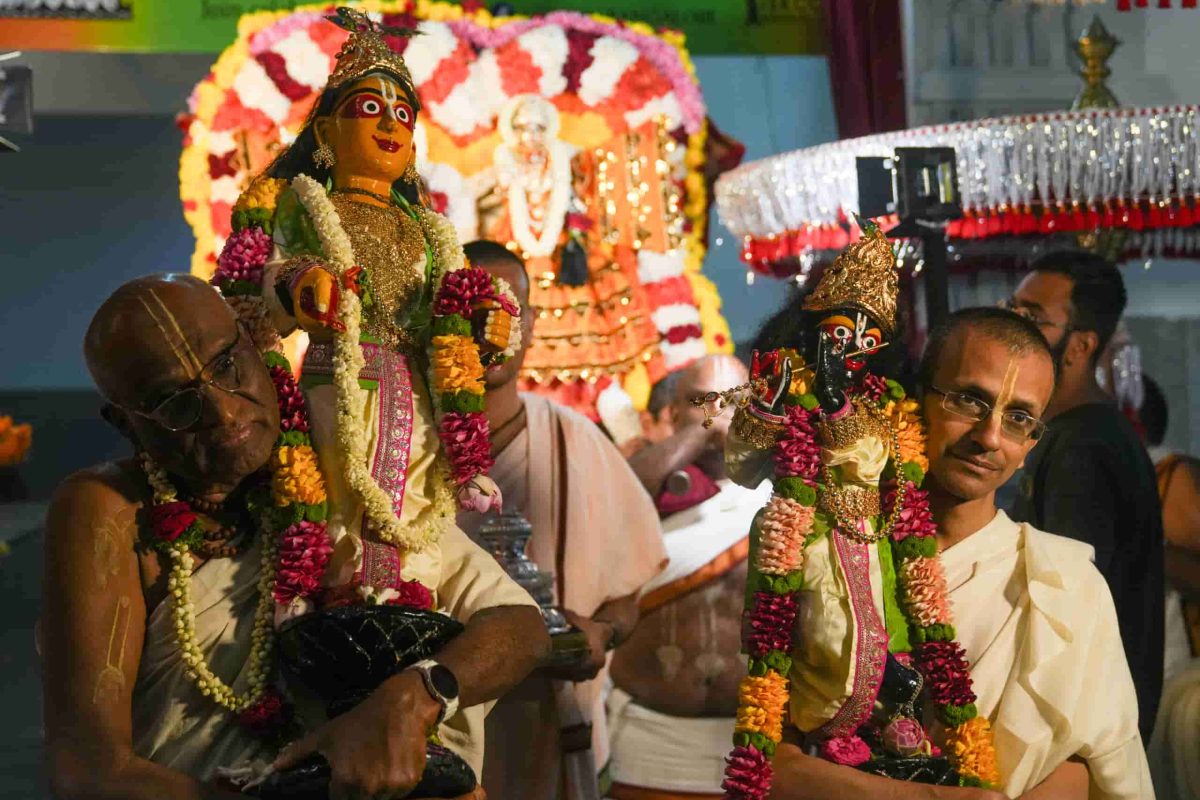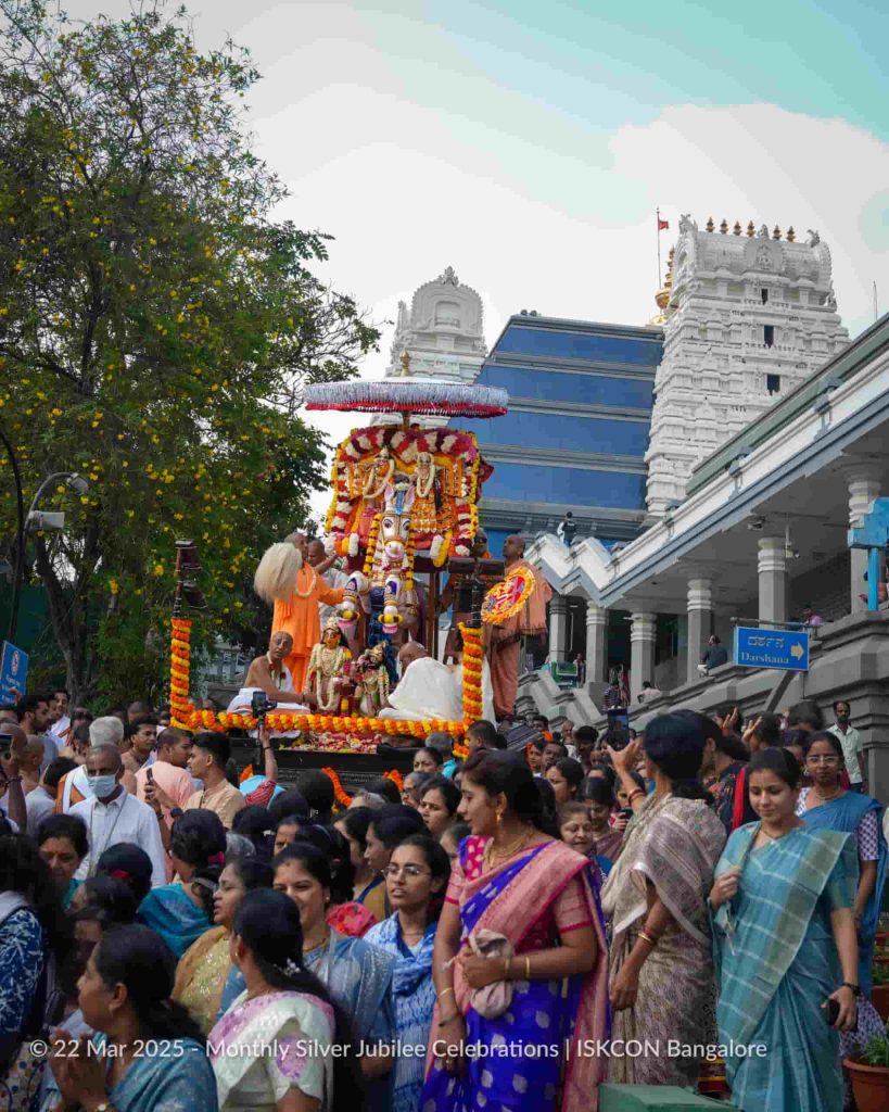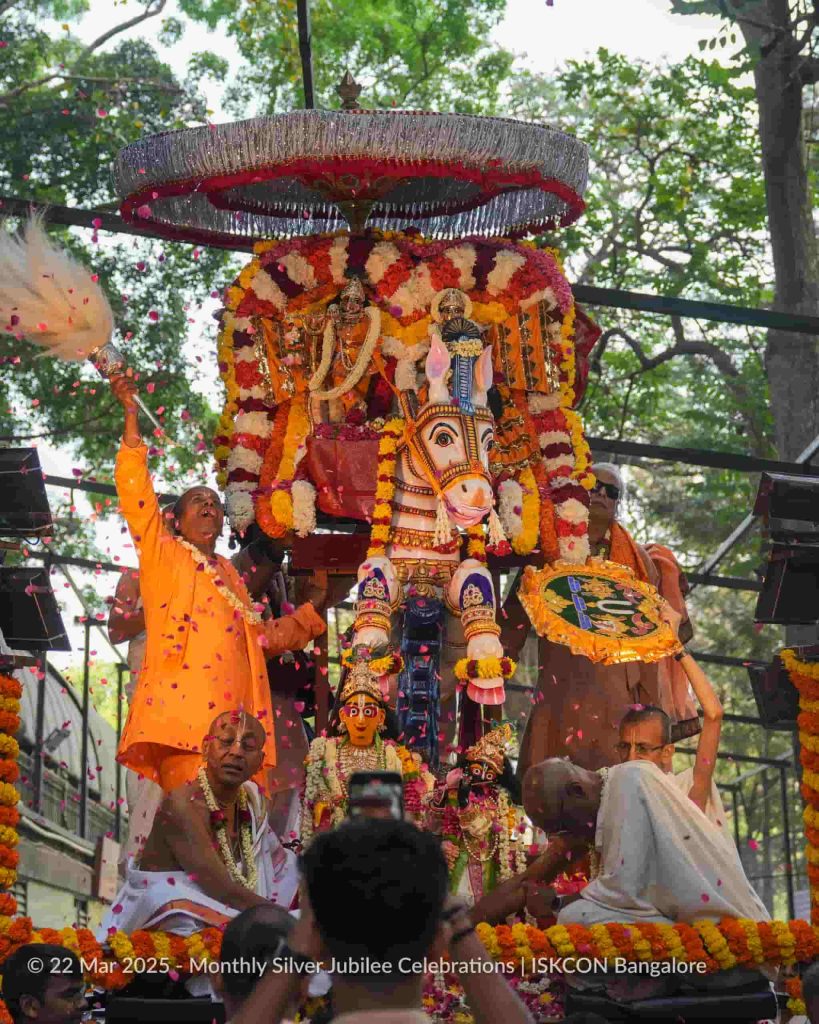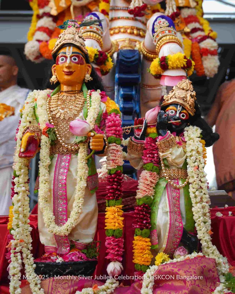 The beautiful Chaka Dola Deities of Lord Chaitanya and Lord Krishnachandra, worshipped by Sri Chaitanya Mahaprabhu’s grandparents, Sri Upendra Mishra and Smt. Shobha Devi. These Deities hold immense historical and spiritual significance for the Gaudiya Vaishnavas. As part of Their South India tour, the Deities graced the celebrations at ISKCON Bangalore, showering Their merciful blessings upon all the devotees.