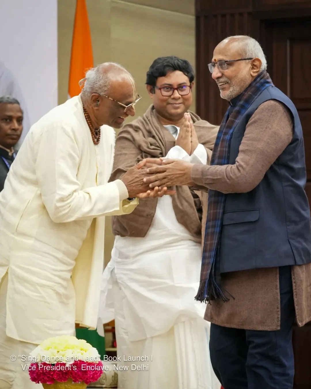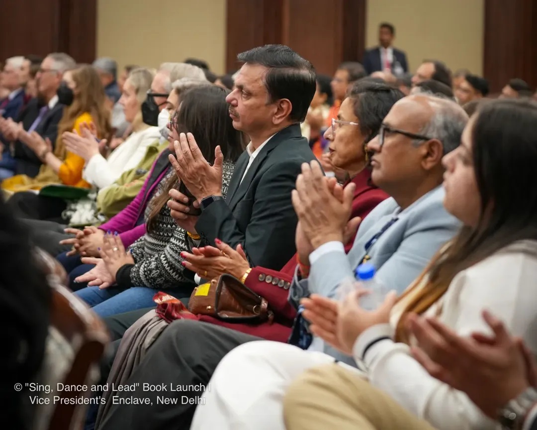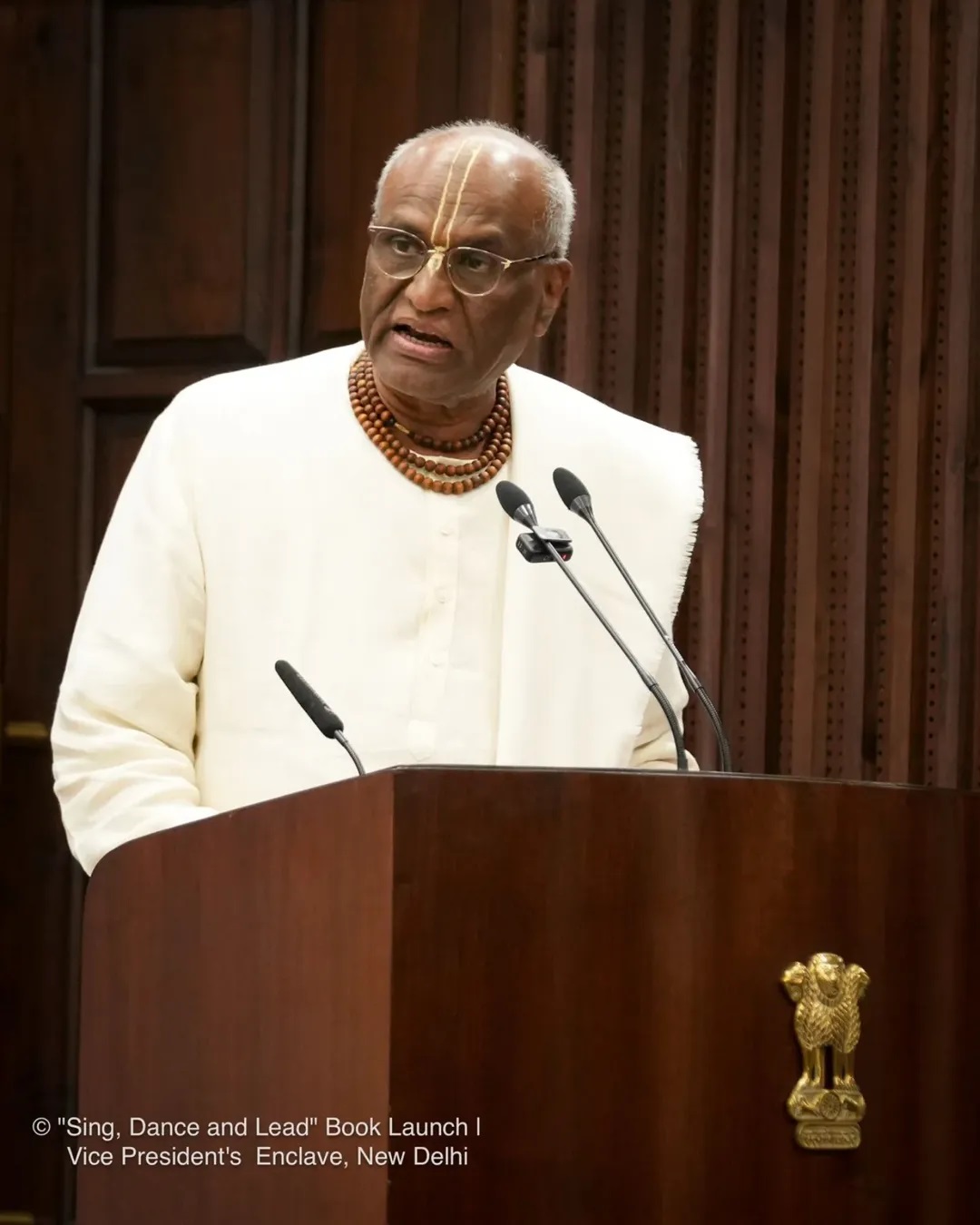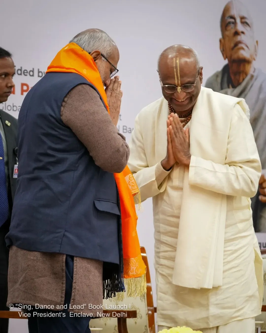 Glimpses of the Book Launch of "Sing, Dance and Lead" at Vice President's Enclave, New Delhi. The welcome address was delivered by Shri Chanchalapathi Dasa, Senior Vice President, ISKCON Bangalore, and Vice Chairman & Co-Founder of The Akshaya Patra Foundation. The author of the book, Prof. (Dr.) Hindol Sengupta, multiple award-winning author and historian, highlighted the significance of humility, surrender, and divine grace in his address. This was followed by an address by Shri Madhu Pandit Dasa, President, ISKCON Bangalore, and Founder & Chairman of The Akshaya Patra Foundation, who spoke on the life and teachings of Srila Prabhupada. He highlighted Srila Prabhupada’s visionary leadership in building the global ISKCON movement and encouraged leaders, professionals, and youth to read the book and cultivate strong leadership qualities.