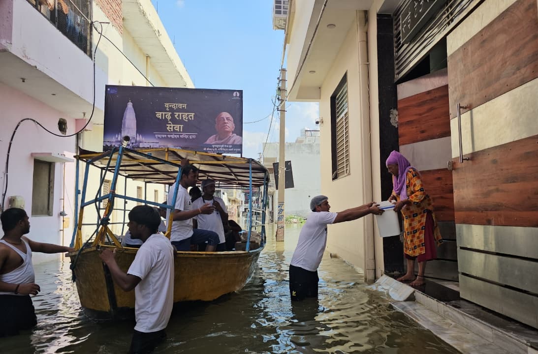 Over the past several days, the rising waters of the Yamuna submerged the holy towns of Mathura and Vrindavan, causing disruption to the daily lives of the residents. Many Brajvasis struggled to access even the daily necessities, with drinking water, electricity, and mobility severely affected.